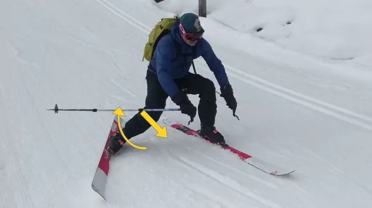 Example 2 : Called the ‘phantom foot’ mechanism[2] which occurs as the skier falls backward in between their skis as the inside edge of the downhill ski catches the snow’s surface sliding the ski across midline of the body(Valgus force on knee with lower leg rotating inwards)