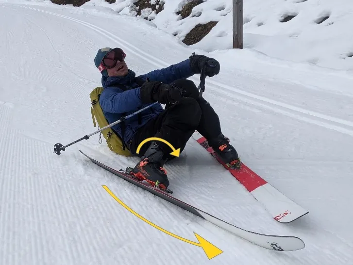 Example 1 : Falling either forwards or backwards as the knees buckles inwards (the shin is now moving VALGUS) as the inner edge of the ski catches rotating the lower leg outwards.